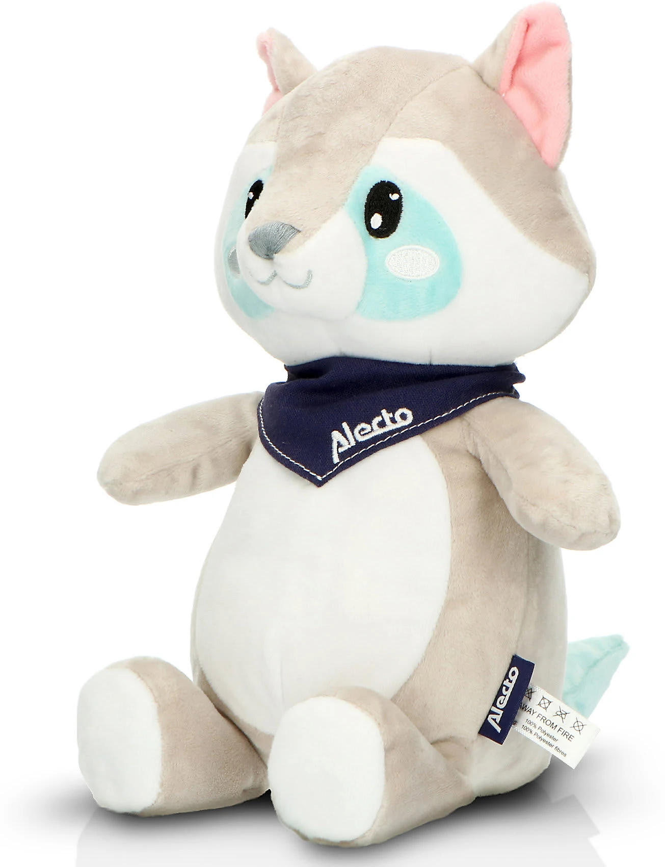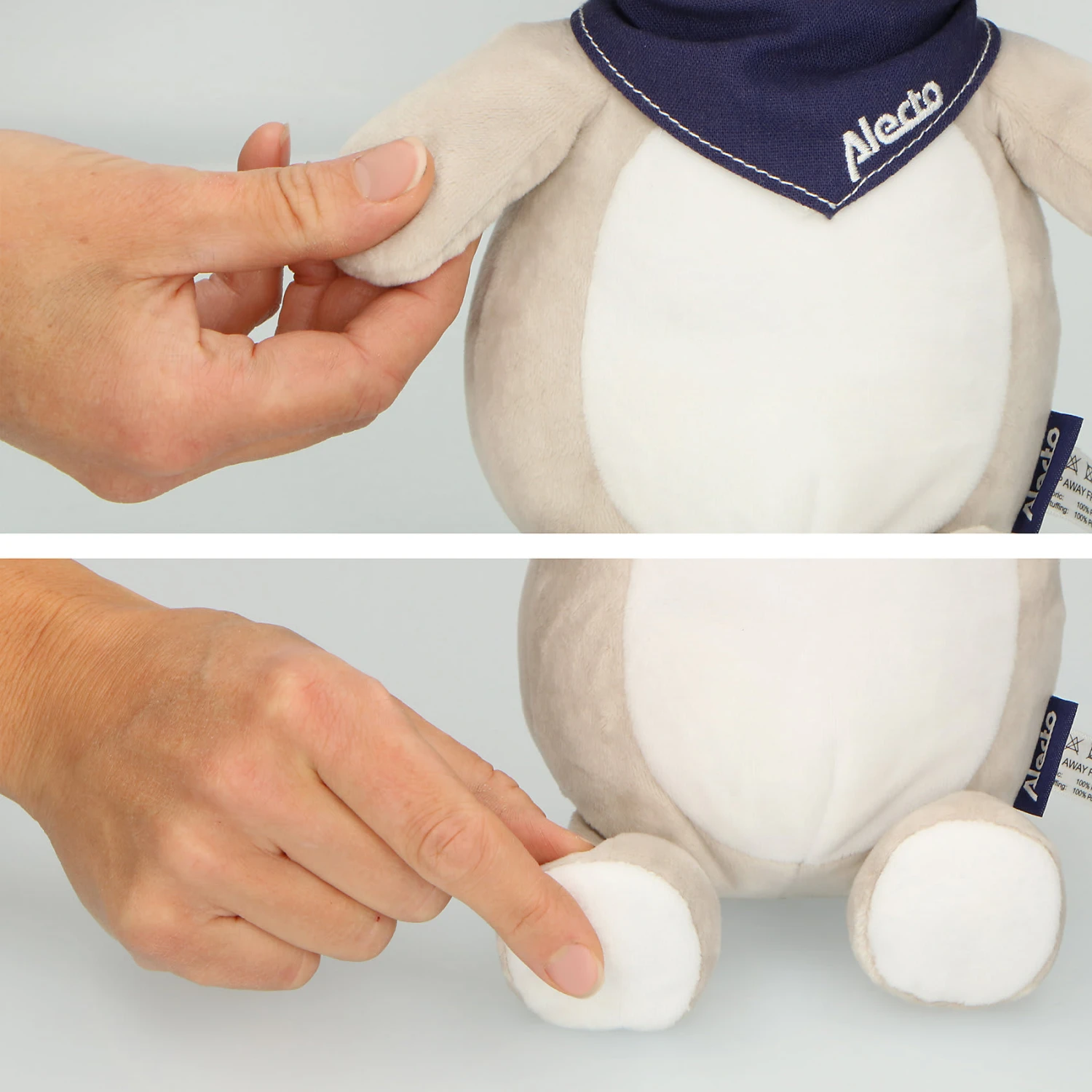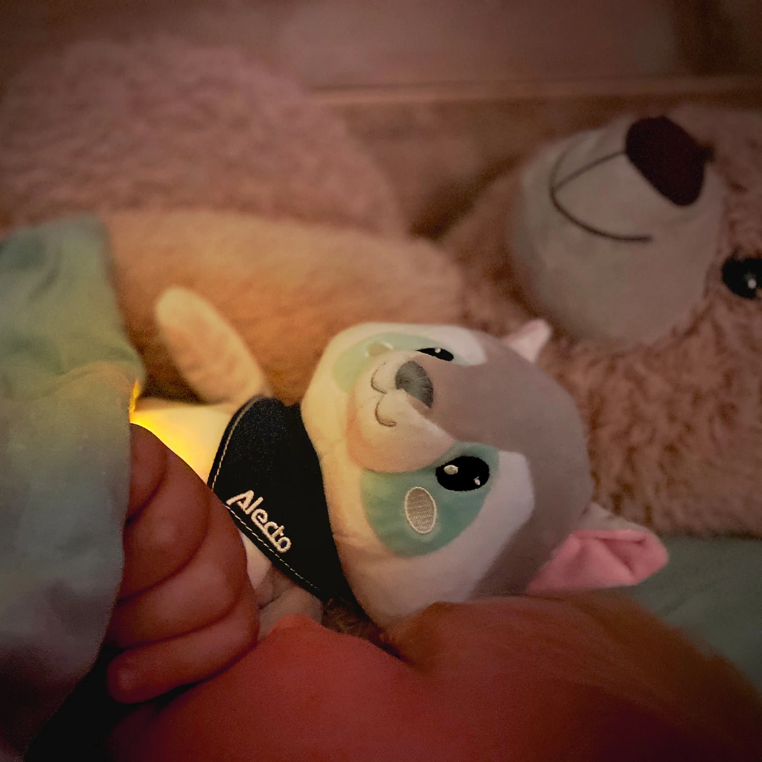Der Alecto BC351 ist ein 3-in-1-Plüschtier, das Ihrem Kind hilft, ruhig und bequem einzuschlafen. Ein schönes, weiches Spielzeug mit einem eingebauten Nachtlicht im Bauchraum und beruhigenden Klängen. Was kann sich Ihr Kind mehr wünschen? Das Kuscheltier hat die Form eines niedlichen Waschbären, den Ihr Kind ganz nah bei sich halten kann. Im Bauch befindet sich ein Nachtlicht, das durch Drücken der Tatze eingeschaltet wird. Um Energie zu sparen, schaltet sich das Licht nach 30 Minuten automatisch aus. Die Farbintensität des Nachtlichts ist durch erneutes Drücken des Fußes einstellbar (3 Stufen + aus). Außerdem ist dieses schöne Kuscheltier mit 4 beruhigenden Schlafliedern und Klängen ausgestattet, die Ihrem Kind ein angenehmes und sicheres Gefühl geben. Denken Sie an Geräusche wie leichten Regen oder einen Herzschlag. Alle Schlaflieder und Klänge sind für 15 Minuten aktiviert, danach schalten sie sich automatisch ab. Die Lautstärke ist ebenfalls leicht einstellbar (3 Stufen + aus). Ein schönes Detail ist, dass der Alecto BC-351 mit einem Geräuschsensor ausgestattet ist. Sobald dieser Modus und damit der Geräuschsensor aktiviert ist, spielt das Kuscheltier bei Erkennung eines Geräusches automatisch 15 Minuten lang Schlaflieder oder Klänge ab, damit Ihr Kind wieder von alleine einschlafen kann. Ohne Hilfe von Mama oder Papa. Danach bleibt der Sensor für 3 Stunden aktiv und schaltet sich erst dann wieder komplett ab. Der BC351 arbeitet mit 3x AA-Batterien, die leicht zu ersetzen sind. Sie entscheiden, welche Optionen Sie wünschen. Zusammen mit der automatischen Abschaltung nach einer gewissen Zeit halten die Batterien besonders lange. Das Stofftier ist auch für die Kleinsten geeignet, also ab 0 Jahren. Die Abmessungen des BC351 – Waschbär-Plüschtiers (32 x 21 x 12 cm) sind angenehm, so dass sowohl jüngere als auch ältere Kinder darin einen guten Kumpel finden werden. Der BC351 besteht aus einem strapazierfähigen Material, das mit einem leicht feuchten Tuch leicht zu reinigen ist.