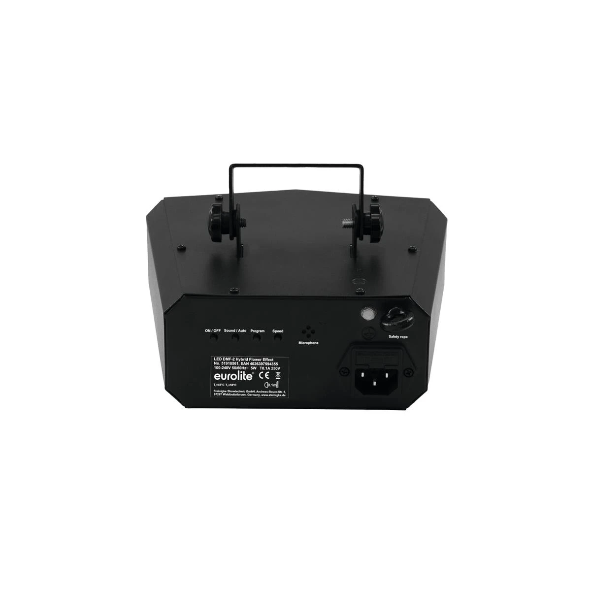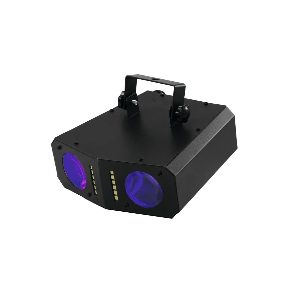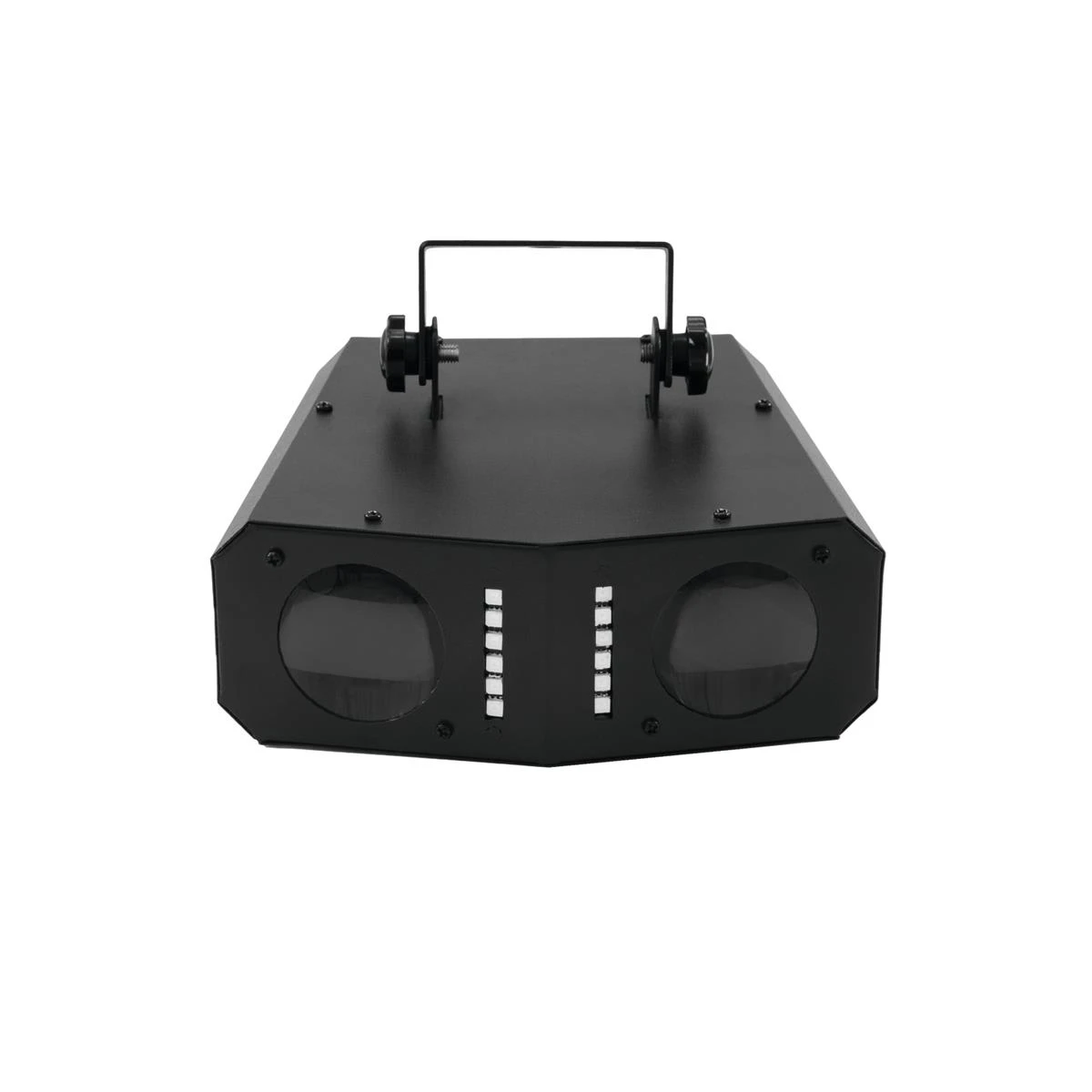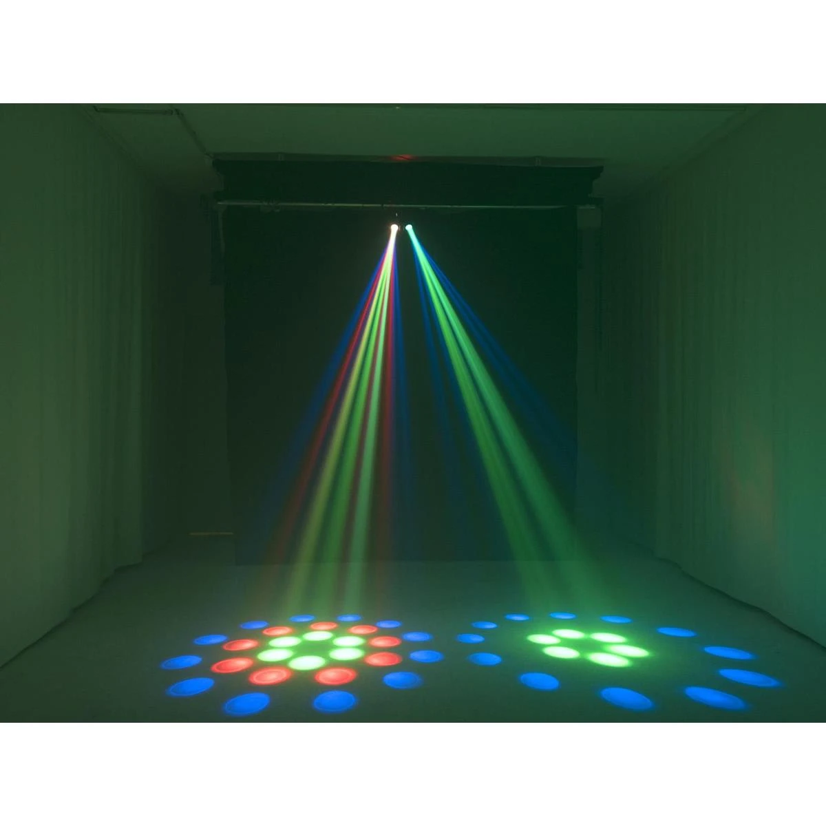 Dieser Lichteffekt ist ein Hybridgerät in einer Mischung aus Doppel-Moonflower und einem Stroboskop. Er erzeugt 2 helle, farbenprächtige Matrixprojektionen. Diese wirken auch ohne den Einsatz von Nebel schon sehr gut, werden aber durch etwas Shownebel noch besser sichtbar. Dann erzeugt der Lichteffekt 2 helle Tunneleffekte.